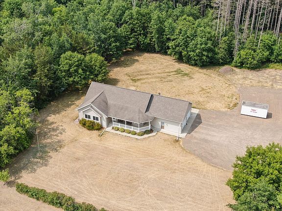 Spacious one-level home on 8 heavily wooded acres. Attached two-stall garage is insulated and heated. Eat-in kitchen\dining room features maple cabinets complete with pull-out drawers in the pantry. Vaulted ceiling in the living room, three main floor bedrooms, mud room and laundry room as well as 3 bathrooms complete the main floor. Lower level has a HUGE family room or play room, another sitting room area, bedroom, an office (or 5th bedroom) and a full bath. Pipes for in-floor heat in basement and garage. Just need to add pumps and a boiler. Additional well and septic for camper parking or building a shed for your toys. (Needs electricity and county approval). You will be delighted to call this your home!