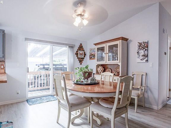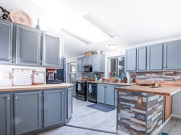 Absolutely immaculate recently updated open concept manufactured home located within the Woodland Park Estates gated community. This home backs up to a small park and offers a fully covered deck for entertaining and enjoying the outdoors. Residents enjoy access to a range of amenities, from clubhouse facilities, pool and hot tub, playground, basketball court, library and more. Three spacious bedrooms and two full bathrooms with ample storage. Updated kitchen with stunning butcher block countertops. Newer dishwasher and stove. The heart of the home welcomes you with an open concept layout, seamlessly connecting the living, dining and kitchen areas. Slider off of the dining for easy access to carport and oversized storage unit. Skylights throughout the home offer an abundance of natural light throughout. Vaulted ceilings throughout. Slider to the back covered deck that overlooks the small park adds another tranquil place to enjoy your morning coffee or entertain friends in the evenings. New roof in 2021. Large garden bed can stay for the garden enthusiast! Fully fenced and private. Don't let this one get away! Only 15-20 minutes to the University of Oregon and downtown Eugene. Excellent shopping, schools and parks nearby.