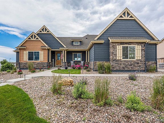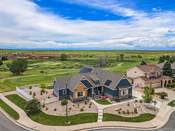 Welcome to this remarkable model quality home in the prestigious Murphy Creek golf course community of Aurora, Colorado. Here you will find a world class resort-like living community anchored by a championship golf course, spectacular golf club, community pool and parks, and miles of walking and bike paths. Your opportunity to join this incredible community awaits with this beautiful Craftsman style ranch home, perfectly perched on a premium over-sized 15,682 sq.ft. professionally manicured lot with spectacular mountain and golf course views...a true 1 of a kind. This home truly has it all to include an open inviting floor plan that is flooded with natural light through the large windows, designer upgrades throughout, dramatic architectural features, and soaring ceilings. The spacious floor plan features a spacious kitchen with gorgeous extended Granite counters, custom tile back-splash, stainless steel appliances, and tile floors. The perfectly located dining area is an amazing space for everyday dining or hosting family and friends. The large family room is spectacular. You will love this inviting space that features an elegant fireplace, extended wide plank wood flooring, and over-sized windows that perfectly frame the outdoor living space and spectacular views of the mountains and golf course. The private and relaxful master suite boasts a luxurious en suite with a 5 piece bathroom collection that includes a large soaking tub, shower enclosure, double vanity and a walk-in closet. The main floor is complete with two additional large bedrooms, a full bathroom, a convenient laundry room, and a convenient tech area. The outdoor living area is a must see! Unwind under the covered extended patio while enjoying mountain and golf course views. You will love the elegant side-load over-sized 3 car garage, Less than 2 year old 13.5 KW solar system with 2 installed EV garage chargers. This "Paid Off" system has banked energy for Seller! Just minutes to DIA, DTC, and Denver!