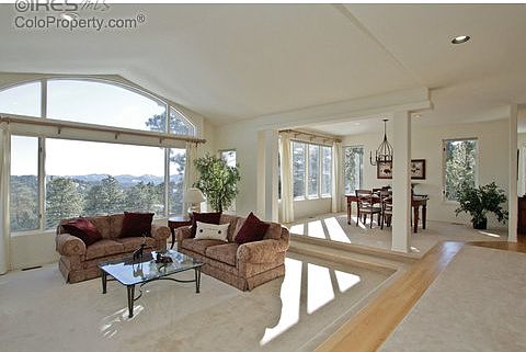 Light & bright home boasts sweeping mtn views, a kitchen w/ gas cooktop, center island, prep sink & eat in space, a living room w/ picture windows capturing the views & a main floor master w/ 5 piece bath & plantation shutters. The lower level accentuates the views w/ a family room, study, 2 beds & bath. Private lot borders open space. North Evergreen w/ easy access to I-70 & 25 min to Denver. Well maintained w/ high $ updates in 2013: hard coat stucco, window panes, concrete tile roof & gutters