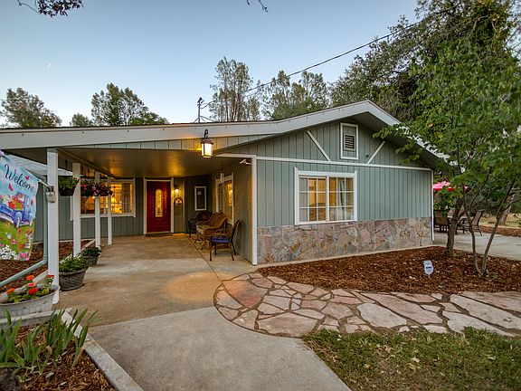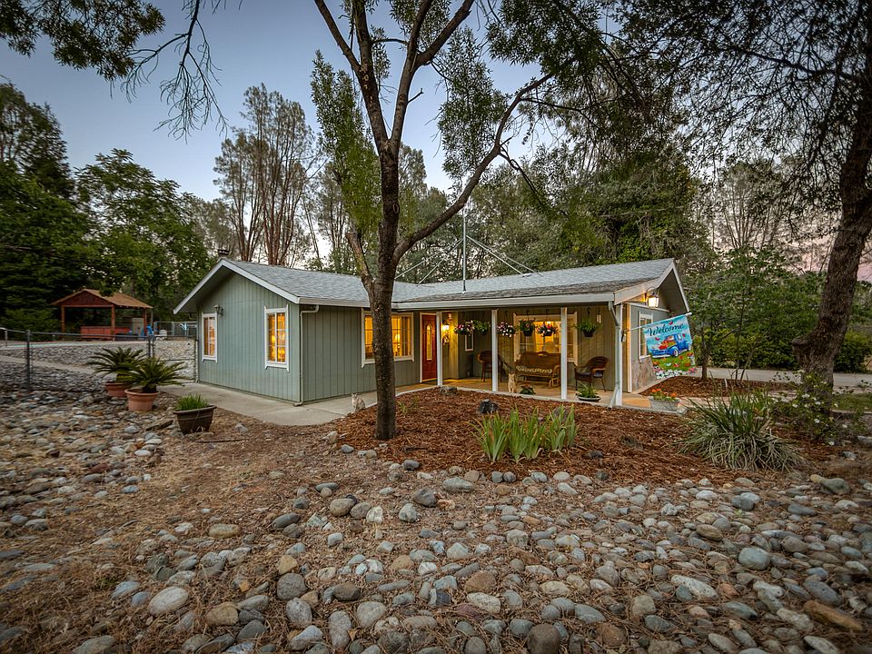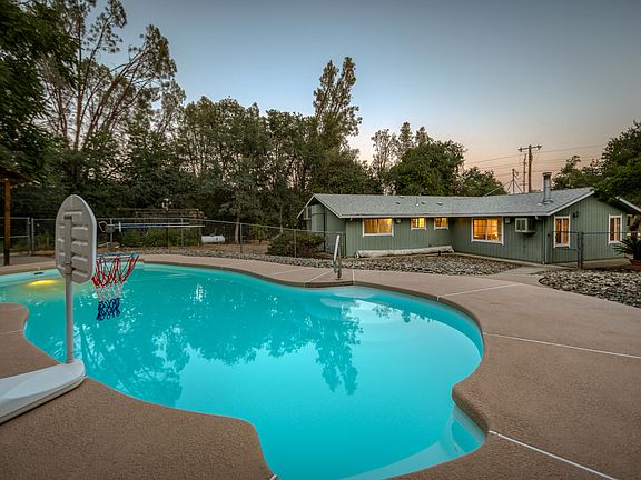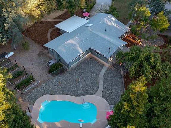 Beautiful 2 Home Setup! Spacious 5 acre property featuring a 1,985 sqft main house with 4beds, 3baths and a 1,100 sqft guest house with 2beds, 2baths. Main house has a master suite and a junior master suite, vaulted wood beamed ceilings and has many recent updates including kitchen cabinets/countertops, flooring, bathroom updates, etc. This property is fully fenced with a front gate and includes a 8'x12' chicken coop with enclosed run, a large irrigated garden area with raised garden beds, irrigated Orchard, gated pens for goats and has many mature oak trees surrounding the home with plenty shade for all of wildlife. The large inground pool is perfect for summer entertaining & bbq's. This is country living at its best with only being just minutes from town.
