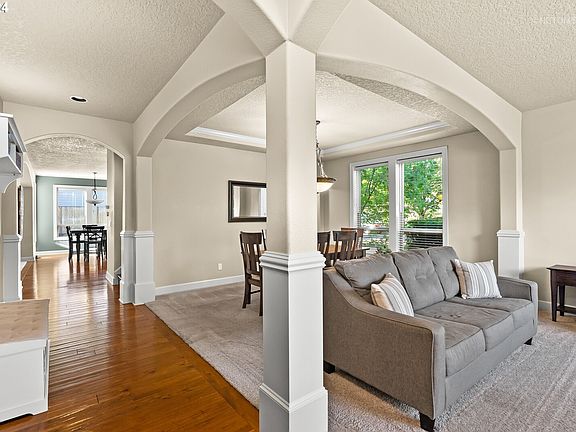 Nestled in one of Sherwood's most sought-after neighborhoods, this stunning 3,272 SF Renaissance home offers a blend of timeless charm and modern convenience! Situated on a desirable corner lot with traditional curb appeal and a quaint covered entry, the home delights with its classic architectural details of arched doorways, deluxe moulding, and coved ceilings. You'll find an elegant formal living and dining room, perfect for hosting gatherings, highlighted by a coved ceiling and a convenient pass-through to the chef's kitchen. The kitchen is a true centerpiece boasting granite countertops, generous work areas, a full-height tile backsplash, and a central cook island with a handy eat-bar. Double wall ovens, stainless steel appliances, and abundant cabinetry complete the space. Adjacent to the kitchen is a cozy family room with a built-in gas fireplace and media wall, offering the perfect spot to relax or entertain. Direct access to the extended patio and fully fenced back yard makes indoor-outdoor living a breeze! Upstairs, the versatile loft area is ideal for a home office or study, complete with a wall of built-in shelving. The primary bedroom suite is a serene retreat with a coved ceiling, an arched nook, a large walk-in closet, and a spacious ensuite bathroom with dual vanities, a jetted tub, and a walk-in shower. Three additional generously sized bedrooms and a hall bathroom with dual sinks provide ample space. The large bonus room is ideal for a media room, playroom, or both! Laundry day is a breeze with the well-equipped laundry room practically fitted with upper and lower cabinetry, a folding station, and a utility sink. With central air conditioning, a central vacuum system, and a main-level powder room, this home is comfortable and ready to go! Located in a coveted Sherwood neighborhood convenient to top-rated schools, local parks, trails, wineries, shopping, and charming Old Town Sherwood, this home offers everything you need and more!