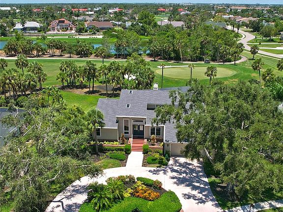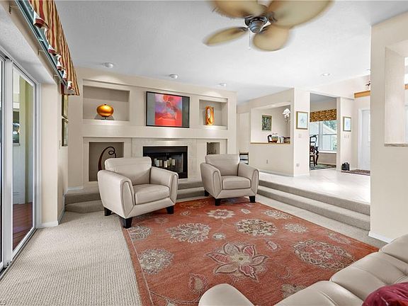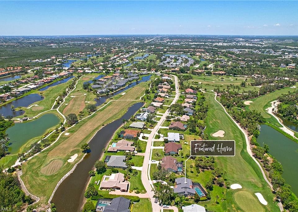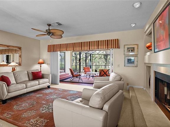 This exceptional neighborhood is renowned for its two award-winning golf courses and its serene surroundings of nature preserves and wildlife. Nestled on an expansive lot overlooking the golf course, this stunning home boasts remarkable upgrades and features. Recent improvements include a new roof, two new air conditioning units, a new pool cage, hurricane impact doors and windows, fresh paint, and more. The timeless architecture showcases strong construction and is ideal for those who love entertaining. The two-level floor plan offers three bedrooms plus a den, a beautiful kitchen, a breakfast room, a formal dining area, a spacious laundry room with ample storage, a two-car garage, and a large pool and spa. Open the pocket sliding door from the great room and step into the outdoor kitchen and entertainment area. Unwind by the pool or enjoy a refreshing beverage while savoring the privacy of the beautifully landscaped backyard. Additional highlights of this home include two wood-burning fireplaces, stainless steel appliances, granite countertops, an entertainment system, and more. The property has not been affected by interior flooding, and membership to the clubhouse is optional. The pride of ownership is evident in the meticulous maintenance of this property. Located just a short drive away are Coconut Point and Gulf Coast Town Center, offering a plethora of shopping, and entertainment.