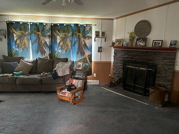 2001 doublewide on a very nice 4 acre setting. Open concept with 2 living rooms, huge primary bedroom with large walk in closet. Kitchen has lots of windows, newer skylights and bar area. Outside is a screened in porch looking out to a huge back yard. Shipping container stays.