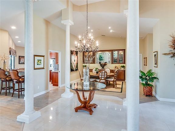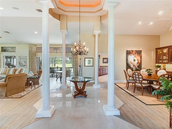 Welcome to your dream home in the prestigious Forest Country Club, a gated community renowned for its beautiful landscaping and exceptional amenities. This stunning 3-bedroom, 2-bathroom elevated home boasts over 2,550 square feet of interior luxury. As soon as you step inside you are greeted by a magnificent pillar foyer with trey ceilings, seamlessly connecting the great room, dining room, and kitchen into an open-plan masterpiece. Tall cathedral ceilings circulates throughout the entire home. The kitchen has a full set of stainless steel appliances with a built-in double wall oven, electric stove top, granite counter tops, and a pass-through window to an outside grill. The expansive lanai extends your living space outdoors, featuring a large pool with a dedicated bathroom. Overlooking the 2nd hole of the Bear Golf Course, the home offers picturesque views. Residents enjoy access to two championship golf courses, a newly renovated clubhouse, and a plethora of activities including golf, pickleball, tennis, and bocce ball, all within a secure and beautifully maintained gated community. This home is more than just a place to live—it’s a lifestyle in one of the most coveted locations