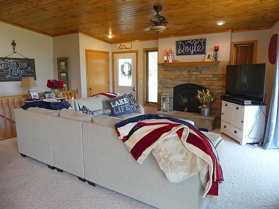 LAKE VIEWS THAT WILL NEVER BE BLOCKED. LOT 133 IS PART OF THIS PROPERTY. PROPERTY HAS BEEN REPLATTED. Sit down, relax and make some memories at the lake. Lake views and more is what comes with this 5 bdr/3 full bath home. Very open floorplan on upper and lower level. Nice stone fireplace in Great Room, dining area and kitchen; master bedroom en suite, 2 guests bedrooms and laundry room complete the main level. Open staircase leads down to the lower level walk-out Family room area. Entertainment area centered around a full bar complete with refrigerator, sink and microwave. 2 more guest bedrooms and a play area complete the lower level. Patio doors open to a concrete patio for more outside entertainment at the oversized firepit. Over sized and heated 3-car garage attached by a covered walkway. Property is just over 1 acre in size and includes lot 133 (front of house) Your lake view will never be disturbed! This home is being offered turn-key minus some personal items. Newers include: stainless steel appliances, paint throughout, new wood ceiling in living room, new quartz countertops, new bathroom countertops, outdoor firepit and patio. Views: Lake View. All Sales subject to LCA transfer fee.
