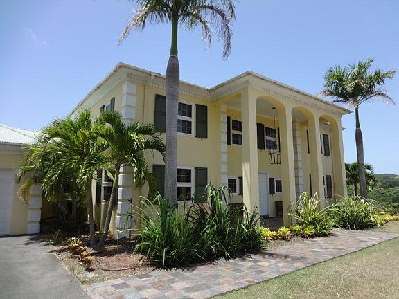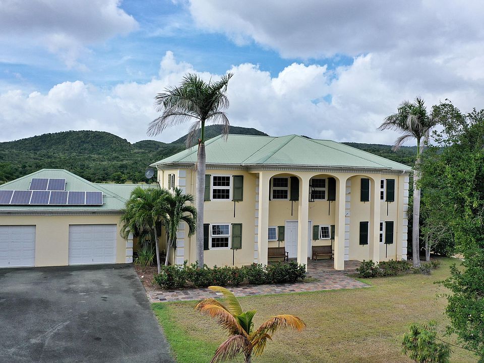 Gracious southern architectural style & solidly built home of poured concrete in gated Carambola Golf community, on a double corner lot; solar power with net metering! Gourmet island granite kitchen and glass tile backsplash w/SS appl, mahogany & granite throughout. Lg. living space w/master BR & BA on main level plus den or study, extra ent. room (or 4th BR) on main; 2 suites upstairs w/ another lounging TV room, tiled pool, 35 KW generator, upper and lower laundry rooms, 2-zoned C/A, 2-car garage, pillared style and West Indian shutters add to the tasteful design and decorator touches...A MUST SHOW!