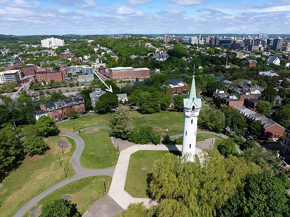 Perched at the apex of historic Fort Hill atop an expansive 0.29-acre lot, this extensively renovated legal two-family sits directly opposite Highland Park and its exquisite monument, offering views in every direction. Built in 1999, this extraordinary property strikes the perfect balance of modern luxury and architectural charm, evoking the colonial-era style of the neighborhood with its double-gabled roof and inviting front porch. It features a luxurious 4BR 3.5BA owner’s residence, an attached one-bedroom apartment or guesthouse, a direct-entry two-car garage, multiple decks, and an incredible terraced backyard—an urban oasis like no other. Recent upgrades include a designer kitchen, renovated bathrooms, extensive landscaping, and custom garage workshop. Central air. Fab finished walkout basement + attic storage. The self-contained 1BR apartment offers exceptional versatility—perfect for rental income, extended family, or a home office—delivered vacant for maximum flexibility.