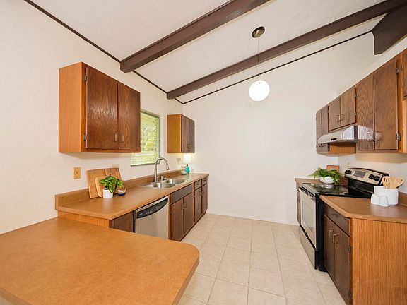 This very charming 3BA/2BA home has been gently lived-in by its current and previous owners. A fairly open layout between the kitchen, dining, and living room, along with a large window overlooking the backyard, and high, vaulted open-beam ceiling make for an inviting space. Each bedroom is moderately sized, with adequate storage space in the closet, and a ceiling fan overhead. Ceramic tile flooring spans the home. There is one full bathroom in the main interior of the home, while the second bathroom lies off the carport in a room that also houses the washer and dryer, a large utility sink, and the electric water heater.