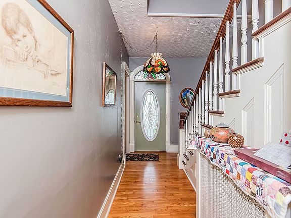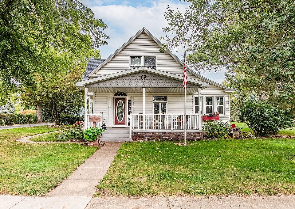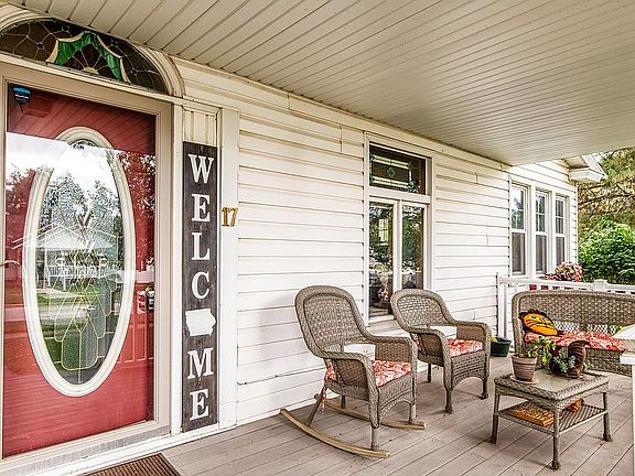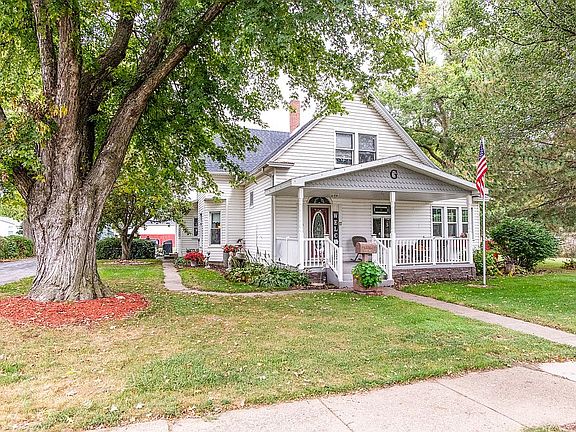 a 1 1/2 story home on a large shaded lot. The open floor plan, includes many stained glass windows, with a lovely gas fireplace that warms the room nicely on a cold winter night. 2nd story has 3 bedrooms and a full bath, and the basement is unfinished.