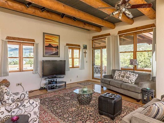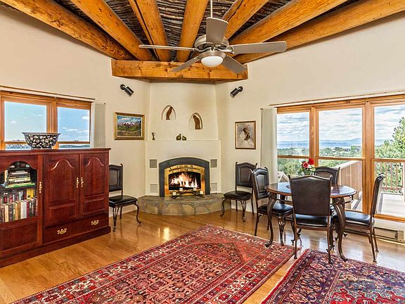 Beautifully sited on 5 park-like acres with spectacular 360 views, Raven's Ridge evokes three words; privacy, serenity and tranquility. Perfect location for exploring the star-filled New Mexico night sky. Great outdoor living areas await at both the front and rear of the home. Enjoy the sun rising over the Sangre de Cristo foothills to the east and setting over the Jemez Mountains to the west from the patios and decks. The main living area of the home enjoys abundant natural light and big views from every window plus generous wall space to display your fine art. The master with ensuite bathroom and recessed atrium tub is nicely separate from the guest wing. The den features its own kiva fireplace by which one can enjoy a book or run a home office. The property also includes an attached 2 car garage plus separate detached 2 car garage. Topping off this great offering is a finely appointed detached casita ideal for guests or a home business. Raven's Ridge is a one owner home only minutes from downtown Santa Fe along the Old Santa Fe Trail.