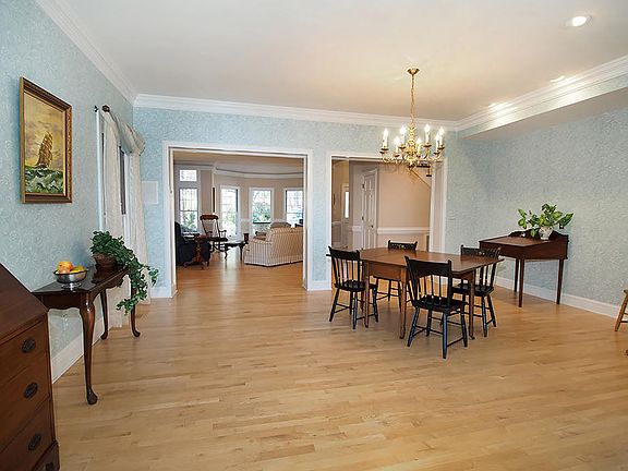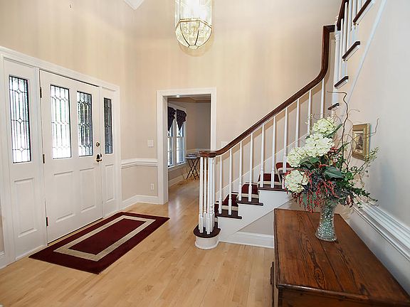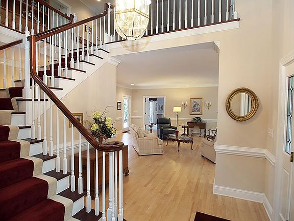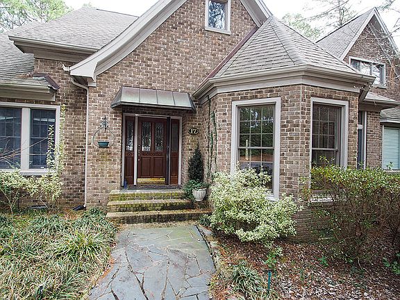 This lovely all brick lakefront home in Pinewild offers beautiful wide lake views and a bright open floorplan with over 4,000 square feet of living area. The property has great curb appeal with mature landscaping, loads of flowering bushes, front and back irrigation system, concrete stamped driveway and parking area, landscape lighting and a slate stone walkway from the drive to the covered front entrance. A gravel walkway meanders from the front of the house through the backyard to the dock and two decks. Designed by Suzy Morgan, the interior is elegant with hardwood floors and deep crown molding in most downstairs rooms and a charming brick floor in the kitchen and keeping room off the kitchen. There is a large living area off the foyer that features a curved window alcove