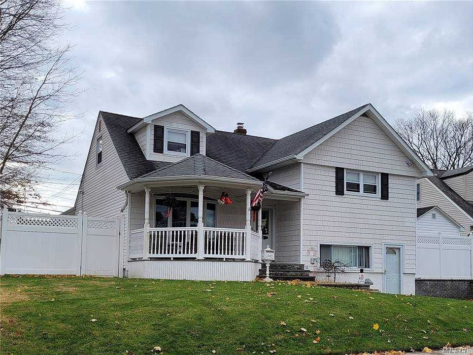 THIS BEAUTIFULLY EXPANDED SPLIT LOCATED IN A MIDBLOCK LOCATION ON A PROF. LANDSCAPED FENCED IN PROPERTY FEATURES A 20X18 GREAT ROOM W/ VAULTED CEILINGS, PORCELAIN WOODLIKE FLOORS, 2 SKYLIGHTS, GAS FIREPLACE & SLIDERS LEADING OUT TO A LARGE TREX DECK OVERLOOKING A WATER FALL POND, GLEAMING HARDWOOD FLOORS THROUGHOUT, ANDERSON & REPLACEMENT WINDOWS, UPDATED EIK W/ GRANITE COUNTERTOPS, FRONT PORCH W/ TREX DECKING & BLUE STONE WALKWAY. UPDTD ELEC 200 AMPS, ARCH ROOF, BETHPAGE SCHOOLS! TAXES WITH STAR $11,755. A MUST SEE!!