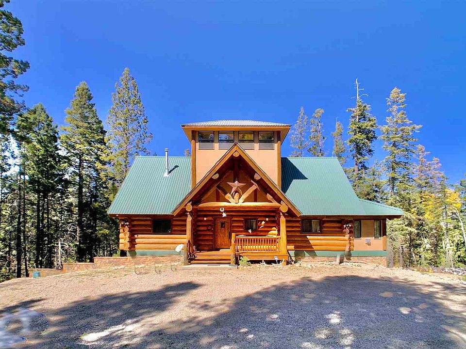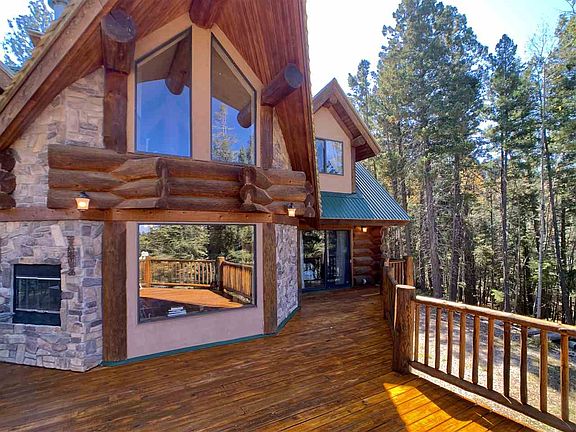 Grand Log Home on 7.3 Acres Borders Ntl Forest. Beautifully constructed with massive peeled logs, low maint stone exterior, home has prow front living & deck looking over acres of aspens to wildlife pond. High end finishes; wood floors, gorgeous tile work, gourmet kitchen, luxury baths. Main level master, living, kitchen, sunroom. Upstairs BR#2,#3, BA, then up to crows nest lookout. Lower level den, sauna, BR#4, BA, utility areas. Huge deck w/fireplace. Parking on 2 levels, back up Generac. Gated prop
