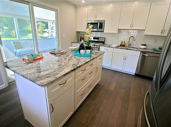 LOW TAXES! Come take a long - this home won't last long! This extensively renovated raised ranch in a quiet family friendly neighborhood is close to shopping and transportation and will sell quickly!! This home has had a full interior makeover - the upper level includes a completely new kitchen with white Shaker-style cabinets, granite countertops and stainless steel appliances, dining room, living room, Master Bedroom with an ensuite renovated bath, two additional family bedrooms and renovated hall bath. The sliders off of the kitchen lead to an updated screened porch and new deck overlooking the fully fenced flat yard and inground pool with newer liner. The lower level contains a family room, legal 4th bedroom, renovated 1/2 bath, laundry/utility room/workshop and a 1-car garage. In addition, there is new hardwood flooring throughout the upper level, new doors, moldings, new driveway and updated electrical. The windows, siding and roof are 10-12 years old. Taxes do not include $586.91 STAR exemption. MUST SEE!