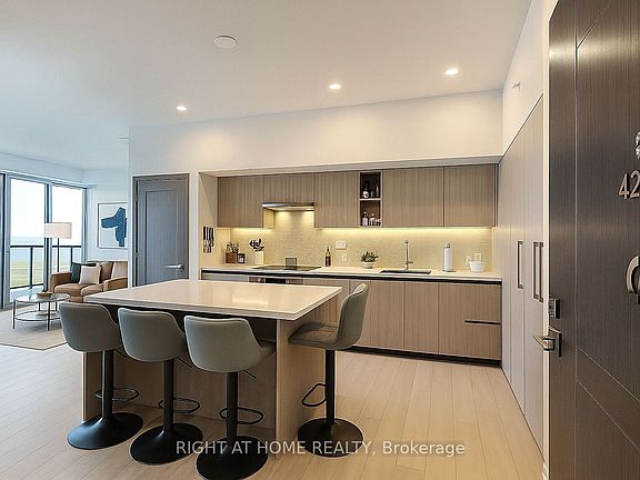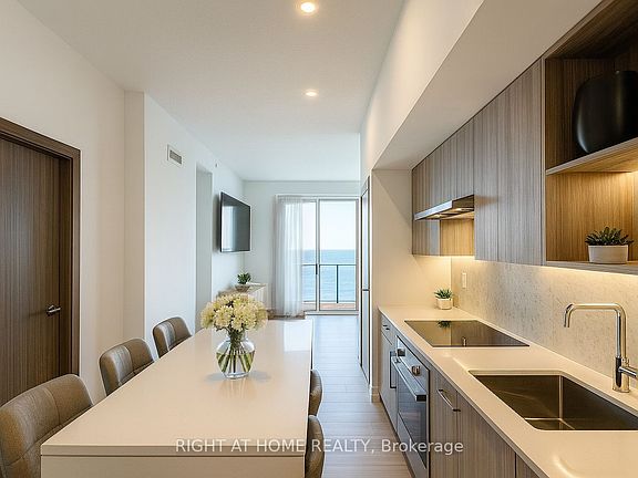 High above the city, where the horizon is painted daily by the shimmer of Lake Ontario, you'll find this rare residence a 2-bedroom plus den (or flexible 3rd bedroom) that stretches across nearly 880 sq. ft. of thoughtful design. The homes defining feature: a sprawling terrace that seems to float above the water, offering a front-row seat to both the serenity of the lake and the captivating ballet of planes gliding to and from Billy Bishop Airport. Inside, the story continues with walls of glass that usher in natural light from dawn to dusk, wrapping every room in an airy glow. The open-concept kitchen is more than a cooking space its anchored by a generous island that doubles as a dining hub, surrounded by sleek cabinetry that hides practical storage in refined style. The primary bedroom offers both privacy and comfort, while the versatile den invites imagination: a home office, a nursery, or a cozy retreat. The second bedroom, equally welcoming, completes the balance of private and shared space. What makes this home remarkable isn't just its square footage, but the way it breathes. The terrace is a rare urban lookout, the views stretch endlessly, and the light feels infinite. It is a residence designed not only to be lived in, but to be felt. Kitchen Island Is Property Of The Tenant.
