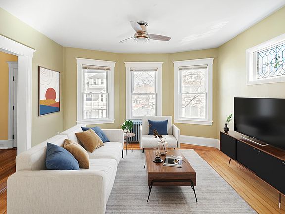 Separate entrance to top floor graciously sized & sunny 2+ bed nestled on a quaint side street, steps to Town Field. Private stairs to foyer w/ stained glass & exclusive front porch. Living room has stained glass & dining room w/ bay windows & hutch. Storage options galore w/ coat closet, linen closet, broom closet & primary bed offers a bonus room that could be a study or walk-in closet. Kitchen includes refurbished walls of cabinets & pantry. Bedrooms are spacious in size. Updates w/ electrical (new outlets in many rooms, outdoor outlets, car charging, & LED's), new tile floors in kitchen, new stainless steel gas stove, new microwave, and fresh paint. Being well insulated & having double pane windows may help w/ utilities during heating season. Private front & rear porches + gardening in the common backyard offer tremendous outdoor space. Access to commuter rail, 73, 74, & 75 bus, Belmont Center, Waverley Square, shops, restaurants, grocery, Beech Street Center, & conservation land. 6-18 months