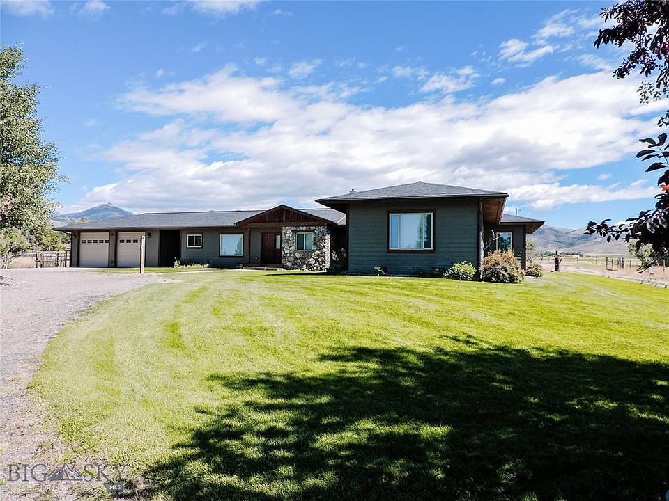 Beautifully appointed one level 2306 SF home on 1 acre with fabulous stone work throughout. This home has a floor to ceiling river rock wood burning fireplace in the living room and custom stone outdoor fireplace with covered patio for outdoor entertaining or relaxing. The kitchen also has a rock faced breakfast bar and corian counter tops, knotty alder cabinetry and solid wood flooring. Master bedroom with en suite bath, jetted tub and tiled walk-in shower. The other two bedrooms are spacious with a full guest bath between them. AC and NG forced air heat. Covered breezeway connecting the home to an oversized heated garage with overhead openers and workshop space. Exterior is concrete composite siding and for lasting finish and yard is fenced for pets in the back and underground sprinklers to alleviate the task of dragging hoses. Powder room off the entry from the garage and a separate utility room and coat closet as you enter. This home was superbly designed and well cared for.