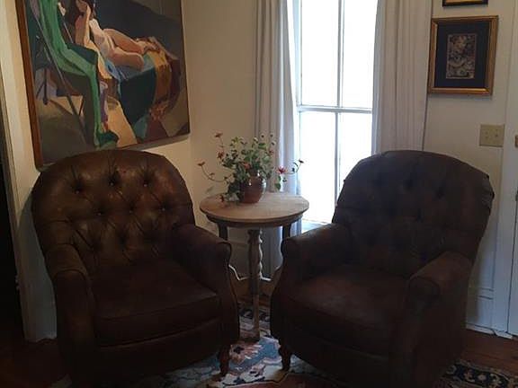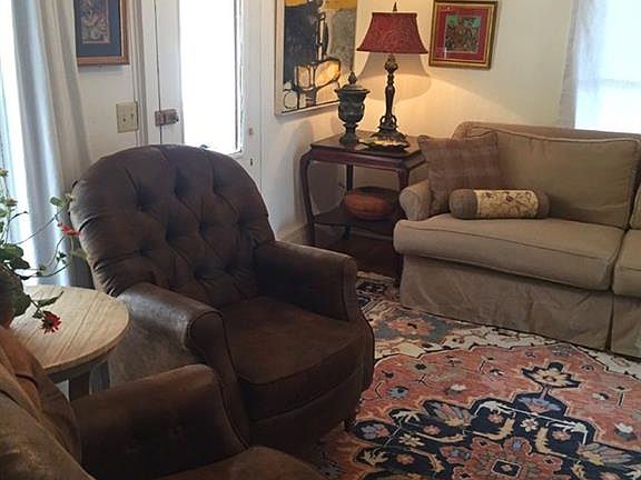You'll feel at home walking into the front door of this cottage with its casual floorplan, vintage wide plank pine floors and abundant windows. Soft natural light makes the living room a cozy retreat and an adjoining main floor bedroom can easily work as a extension of the living space as a media or reading room. The heart pine plank floors continue into the breakfast room and kitchen that overlook a wooded ravine giving these rooms a treehouse feel. New granite countertops, open shelving, white wainscoting, chair rail molding, and a porcelain farm sink create a modern cottage style kitchen ready for entertaining. A sunny laundry room off the kitchen boasts another porcelain sink, washer and dryer, and a half bath. A staircase to the second floor has an inviting bench seat in the upper level sitting room. An adjoining guest bedroom has pine plank floors and a large closet with louvered doors. The master bedroom is spacious with a vaulted ceiling and painted wood floors. The roomy upstairs bath has white wainscoting with a vintage porcelain clawfoot tub and a separate shower. The porcelain hand sink has a custom cabinet with storage underneath. A large linen closet with double paneled doors and shelving offers more storage space. A covered porch stretches across the front of the cottage and wraps around both sides. The south porch overlooks several flower beds and a greenbelt creating a great relaxing spot to catch a breeze. The home has been improved and maintained with a new roof, new central heat and air, and a backup mini-split system on the upper level for additional comfort. A walkout basement provides room for a workshop and more storage. There are three off-street parking spaces. You will enjoy the quick walk to downtown shopping and dining just a few blocks away.
