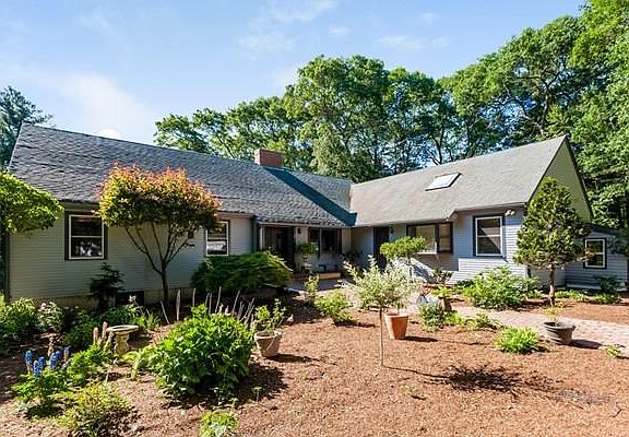 A sanctuary. A sprawling Ranch home set on four acres. Find serenity only minutes to I-95 and I-93. Well maintained home with lots of features for comfortable living and entertaining. Exposed natural wood Ponderosa Pine beams, vaulted ceilings, and skylights through much of the house, for a contemporary-rustic look and warmth. Living room features skylights and double doors to the wrap around deck, with a beautiful view of the private land that features a back yard for play, and flower beds. Granite and stainless steel kitchen opens to dining room with exposed brick and wood burning fireplace. Separate sunny breakfast nook for casual dining. Updated baths including a new modern master bath in white tile. Sun splashed and huge (24x22) family room features propane stove, and also has exposed beams and Cathedral ceilings with skylights, and three directions of windows. Full walk-out basement is partially finished, for added storage space and expansion possibilities.