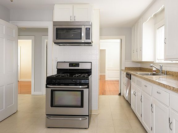 Walk into the spacious first floor unit with a living room and dining room. Gleaming hardwood flooring and Wainscoting. Plenty of light through the windows. Two bedrooms and a bonus third room that could be used as a guest room, or office/study. Kitchen with plenty of cabinet space, gas range stove, dishwasher and disposal. Back porch outside of unit and a yard that is shared. Basement has new washer/dryer and some storage. Ready for immediate move in. 2 off street parking spaces included - 1 is garaged, the other is tandem.