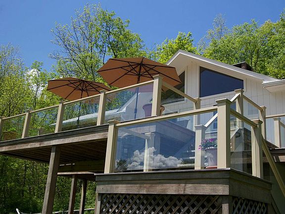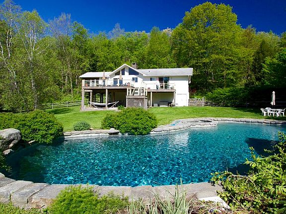 Modern home has been tastefully redone. Lofty, open main rooms, stone fireplace, screened porch & deck overlooks the views. Main level has 3 BR, 2 baths. Den, half bath, laundry on LL. Central air. Expansive lawn. Heated Gunite pool with granite coping.