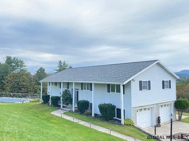 Million Dollar Views of VT mountains. Main floor:solid oak hardwood floors, open floor plan, Living & Dining rm. Sliders in the living room leads out to the deck overlooking the spectacular views and in ground pool. Pool has new liner and has been professionally maintained. CustomKit. newer appliances. Family rm has a bar, fireplace, & pellet stove. Walk/out lower level leads to spacious yard and pool area. Anderson windows, New Seamless gutters. 3 heat sources, heated garage. 3.24 country acres. This beauty won't last long.