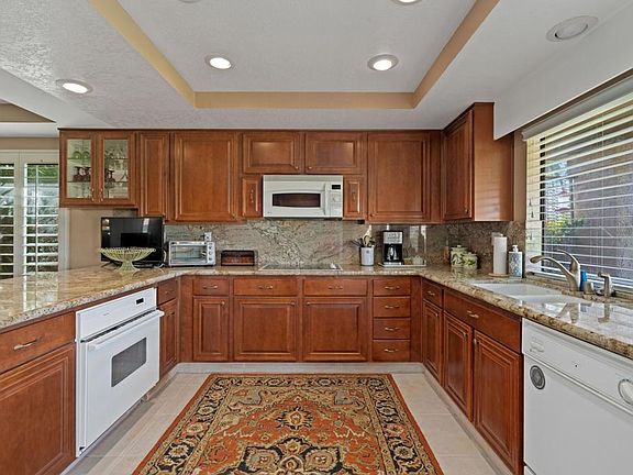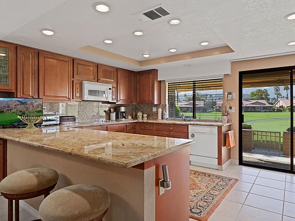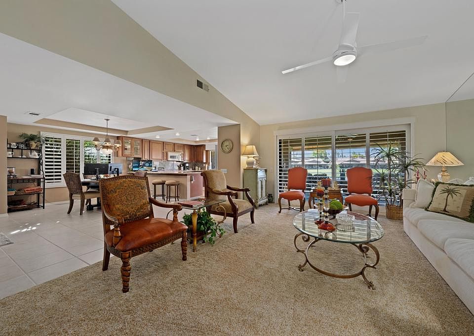 Fantastic home nicely remodeled ready for immediate occupancy! Partially furnished, this home is both warm and inviting. Step onto the light tile floor & the large ample main living room greets you. Vaulted ceiling above offers thoughtful detailing. Sliding glass doors at the homes rear elevation lead to a large covered terrace with an awe-inspiring view. Additional upgrades include: Open concept remodeled kitchen with wall removed, updated cabinets, granite counter tops, enclosed atrium, LED lighting, extended patio with wall, awning, shutters, bathrooms remodeled with updated cabinets, counter tops, plumbing, finished garage with cabinets and much more.