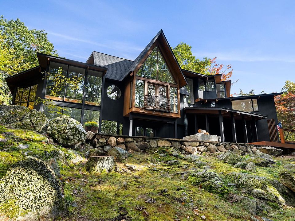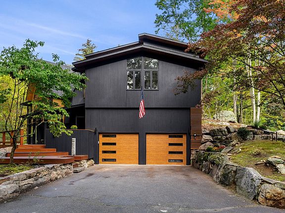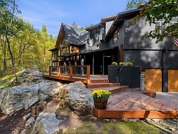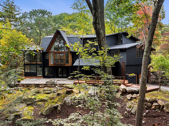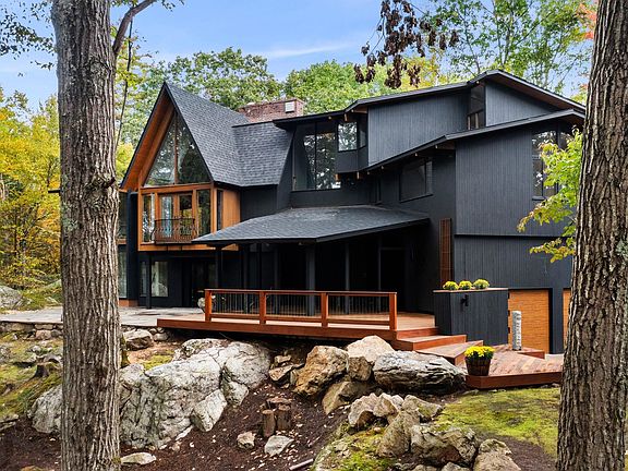 Rising gently from the earth around it, the Tree House does not rush to reveal itself. The home sits in harmony with its natural surroundings, offering a soft transition from the lush forest to its rich black & brown exterior. Just as it honors the land, it honors the light. Biophilic by design, the Tree House is one with nature. Set on 8 acres at the end of a cul-de-sac, an original & highly sought-after Acorn Deck House has been fully renovated by DHB Homes. 4,700SF of living space where no detail has been left to chance. Airy floors paired with light walls & original mahogany beams - the mix of mid-century modern and new flows effortlessly. Sleek & custom Cabico kitchen cabinets align with matte white appliances & a waterfall quartz top. Two fireplaces flank the Conservatory, each with its own personality - one fit with original brickwork & the other modernized with a crisp oversized mantel. The Conversation Pit is flush with a tailor-made leather sofa. The uniqueness of the home is enhanced by modern finishes. Each room was thoughtfully designed & selections made with functionality, purpose & beauty in mind. The layout is seamless - one room opening to the other with soaring ceilings & endless floor to ceiling windows looking out at acres of abundant forest & moss-covered rock. Outside boasts a large mahogany deck with glass spindles, natural blue stone patio with fire pit, lighted waterfall feature with a koi pond & an utterly spectacular screen porch. The Tree House.