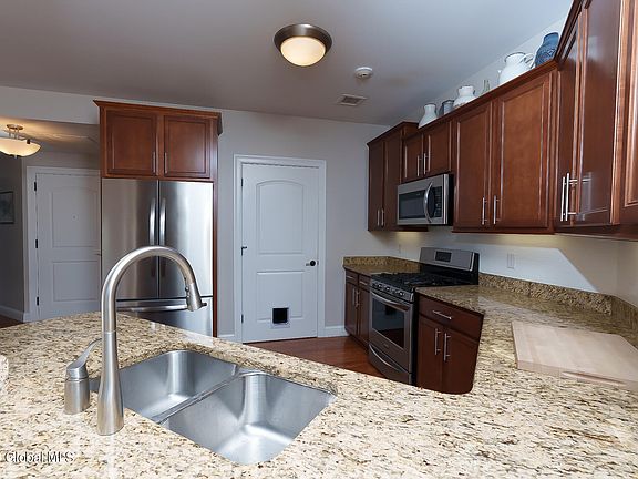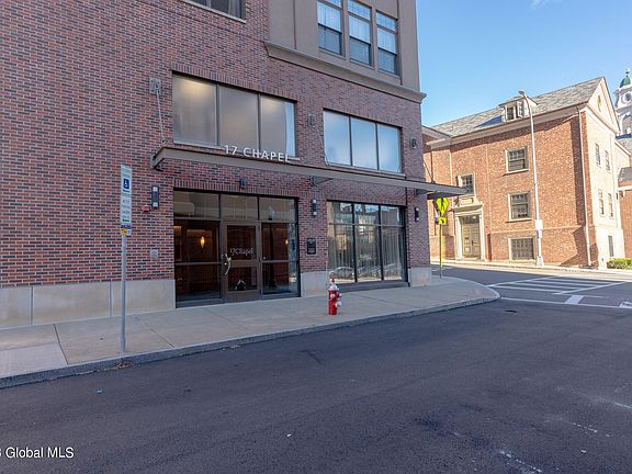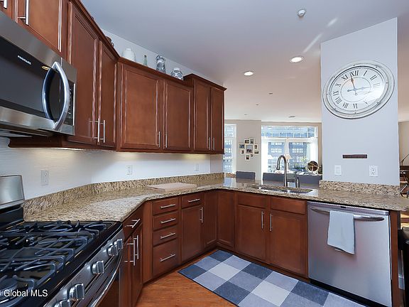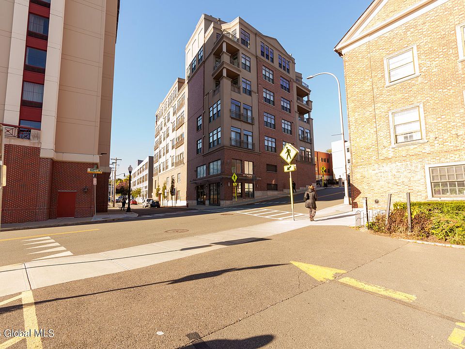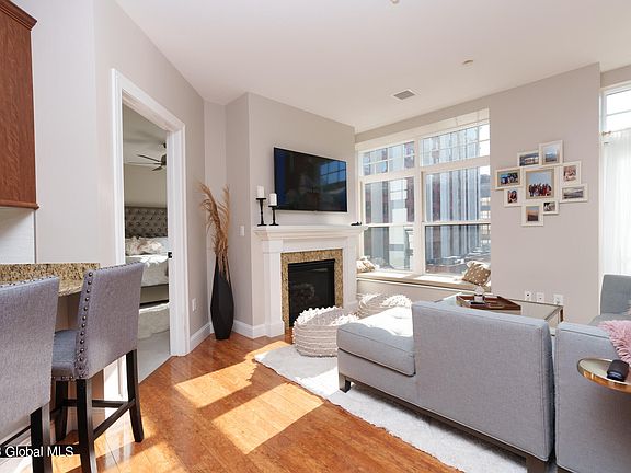 Downtown convenience at its best. Excellent opportunity to own this Luxury maintenance free 3rd floor condo w/ indoor heated parking space. 2 beds, 2 baths featuring open floor plan with oversized sliding glass doors to the French balcony. Natural lighting throughout. Custom soft close cabinets, granite counters, tile backsplash, vented microwave, stainless steel appliances & disposal. Walk-in pantry & laundry. Spacious primary suite w/ large WIC, oversized walk-in shower & double vanity. Key fob security system. 2nd FL fitness center, rooftop patio overlooking Hudson River. Steps to Park, Palace, Yono's, McGeary's, Capital Rep, Albany Distilling, & more!