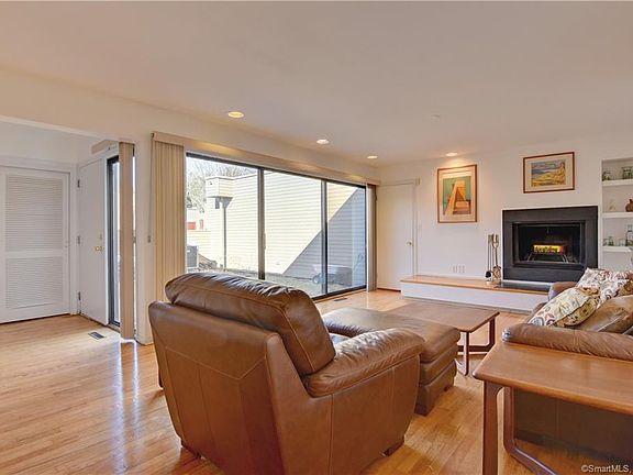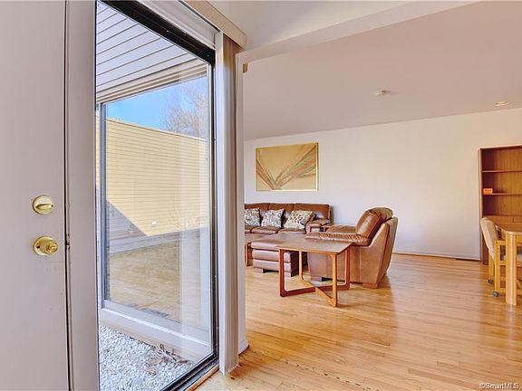 If you are looking for a low-maintenance condominium that lets you enjoy indoor outdoor living this beautiful and bright home is for you! Featuring mid-century style with large glass doors opening to a private grassy courtyard, this beautiful unit features hardwood floors throughout, recessed lights, programmable thermostat and ceramic tile in the bathrooms and kitchen. A convenient 1st floor laundry closet is across from a full bathroom, in addition to another full bathroom off of the master bedroom. which also has a sliding glass door to the courtyard. A second bedroom features built-in shelving. The spacious living room features more built-in shelving as well as a beautiful wood burning fireplace for enjoying all seasons. The partially finished basement with storage areas has a separate entrance from the courtyard, its own heat zone and could be updated for many different uses. The eat-in kitchen with wide format ceramic tiles has abundant counter space as well as a built-in dishwasher an adjacent dining room area. This unit also has newer HVAC, and a carport that leads to your front door with minimal stairs. If you want to get out, take a stroll down the lushly landscaped pathways of the complex with multiple koi ponds, sitting areas, and a serene in-ground pool area with Sleeping Giant State Park in the distance. This home in more than a condominium, it is a lifestyle. But units in this complex rarely hit the market so act today!