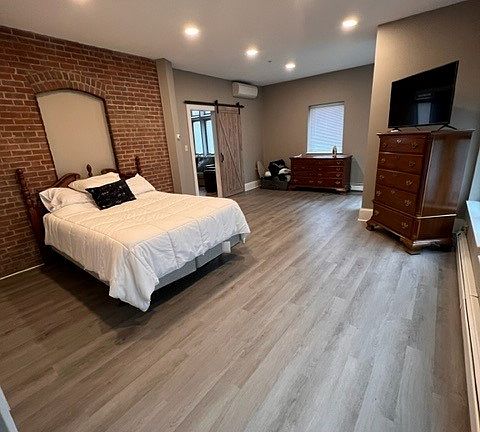 Classic architectureSpacious bedroomOpen concept livingLarge windowsExposed brick