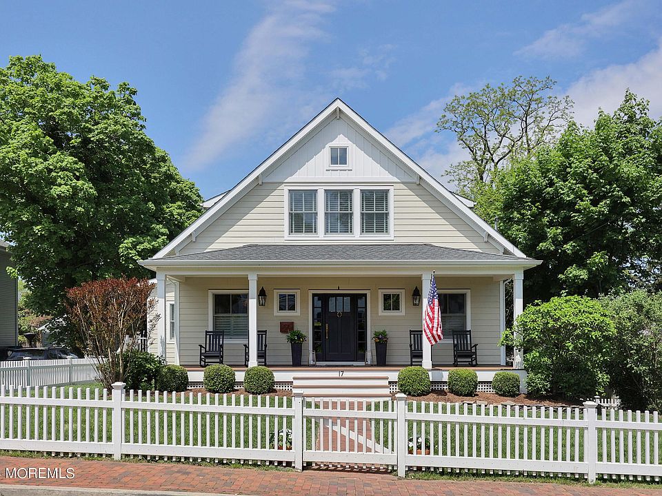 Welcome to the epitome of coastal living in Fair Haven's most sought-after historic district! Renovated in 2016 this stunning shore vintage Arts and Crafts style home invites you to relax on the full rocking chair front porch or to host gatherings on the rear expansive covered porch, perfect for entertaining family and friends. Inside, discover 3 bedrooms and 3 full baths, along with a formal living room and office/extra bedroom, seamlessly blending shore charm with modern amenities. Hardwood floors throughout guide you to the gourmet kitchen, boasting slate and marble countertops and top of the line stainless steel appliances. Expansive bar area with hardwood top and open shelving make for a welcoming area to entertain guests. The spacious great room centers around a wood-burning/gas starting fireplace, perfect for cozy evenings at home. Retreat to the luxurious master bedroom with a walk-in closet and en-suite bathroom. With its proximity to the Navesink River, downtown Fair Haven, and Sickles School, this home has it all!