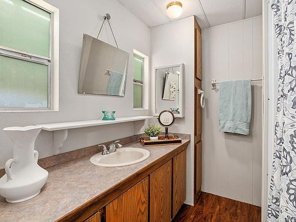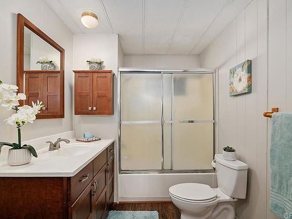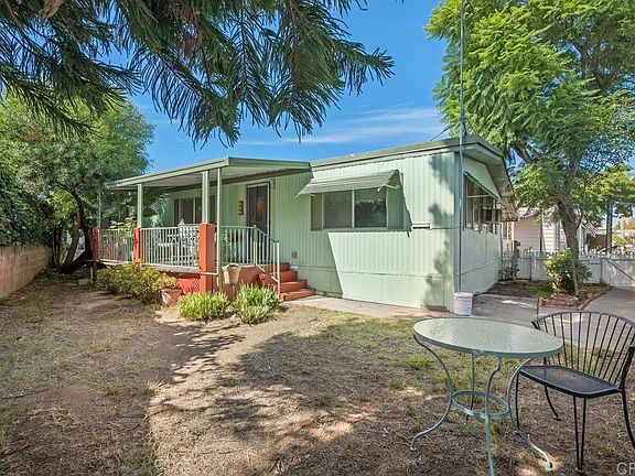FAMILY PARK NO AGE RESTRICTIONS. Possibly the best and largest lot in the park. Located at the very end of a private street this property features essentially two private and spacious back yards. So many outdoor possibilities to make this your outdoor haven. In addition one of the back yards has a lovely grass area that includes mature Asian pear, tangelo and grapefruit fruit trees. This very spacious 2 bedroom and 2 full bath is one of the largest mobile homes in the park and could easily be converted to a 3/2 as it has a large open living area adjacent to the living room that can be converted to an additional room, office or family room. In house full size laundry closet, and both bedrooms feature large walk in closets. Same owner for almost 40 years so home needs a little TLC but pride of ownership and fabulous opportunity and priced accordingly. New paint, upgraded guest bath, community pool, and low space rent. Community covers trash, pool and clubhouse maintenance. Large covered car port could fit 2 cars easily possibly 3. Conveniently located close to the 15 and 78 freeway. Endless possibilities. Come make your vision come true. Rent restricted. Owner are not allowed to own more than one unit in the park.