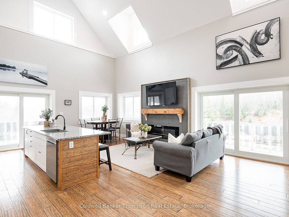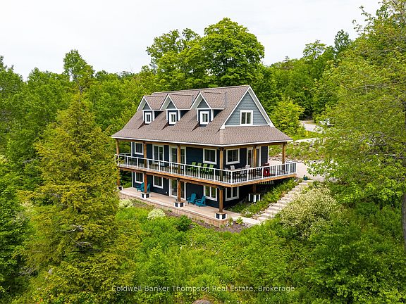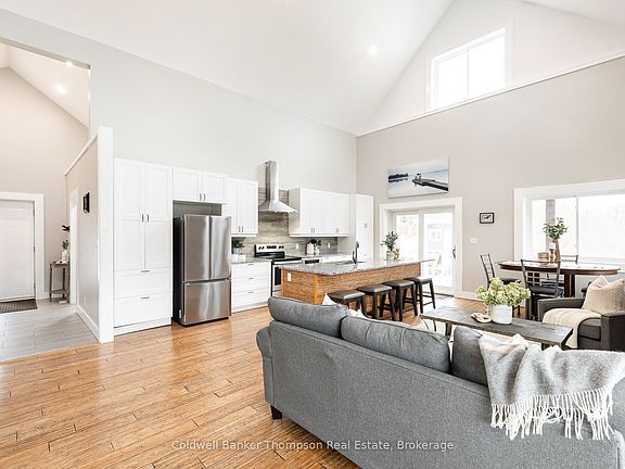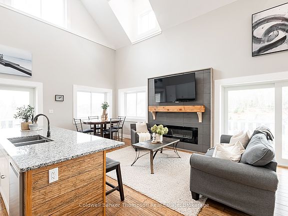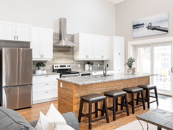 Nestled in the heart of Muskoka, this stunning executive home or off-water cottage overlooks the picturesque Deerhurst Highlands Golf Course, offering breathtaking views and an unbeatable location. Step into the spacious foyer, where a large coat room and a convenient powder room provide a warm welcome.The main floor features soaring vaulted ceilings throughout most of the space, enhancing the open-concept living, dining, and kitchen areas, which are designed for both comfort and entertaining. The kitchen is a chef's dream, boasting a massive island, solid surface countertops, and an abundance of cabinetry, including a pantry with pull-out drawers and ample storage. The living room is centred around a modern electric fireplace, creating a warm and inviting atmosphere. From the kitchen, step out onto the expansive wrap-around porch with durable composite deck boards and take in the breathtaking golf course views perfect for relaxing or entertaining. The main-floor primary suite is a true retreat, featuring a 4-piece ensuite, a walk-in closet, and private laundry facilities. Upstairs, a versatile loft-style bedroom features a 3-piece washroom and generous closet space. The fully finished walkout basement offers a spacious rec room, two additional bedrooms, another 4-piece bathroom with secondary laundry facilities, and a well-organized utility room. Enjoy the convenience of municipal services, including natural gas, water, and sewer, as well as curbside garbage pickup and high-speed internet. Ideally located near Deerhurst Resort, the renowned Mark O'Meara Golf Course, and Hidden Valley Ski Resort, this home is also just a short drive from downtown Huntsville's many amenities. A perfect blend of luxury, functionality, and prime location is Muskoka living at its finest!