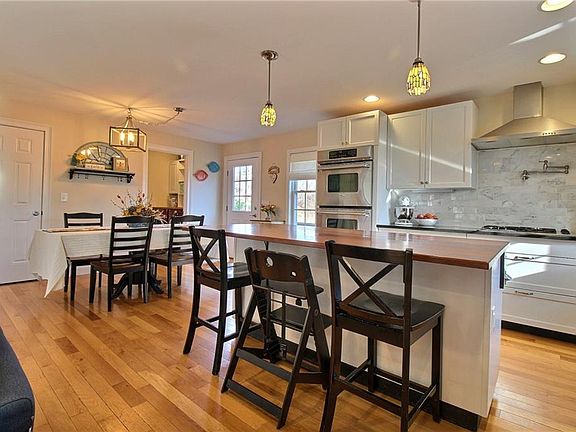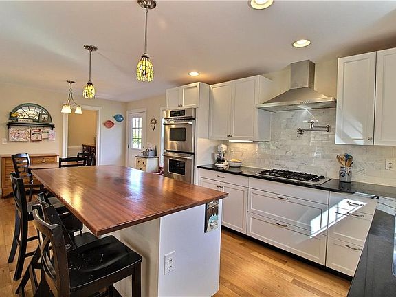 Tucked away on a dead-end street provides a peaceful setting on 1.5 acres with views of the Shelter Harbor Golf Course. This very well appointed home boasts over 2400 square feet of living space with a master suite on the first floor. The custom kitchen has desirable white cabinets, granite counter tops with a butcher block top on the island with pendant lighting, gas cooktop with a stainless steel pot filler, stainless steel appliances to include double ovens and a marble backsplash. The first floor has an open concept floor plan with a gas stone fireplace to accent the space. The first floor master suite has his and hers closets with built-ins that lead to the full bath with a stand up shower stall, jacuzzi tub and double vanity. Walk upstairs and admire the charm of the slightly winding staircase that opens to a light and bright common space, perfect nook to relax. Upstairs, you'll find 3 very generously sized bedrooms plus an office. There is a large full bath with a double vanity, stand up shower and tub to accommodate the bedrooms. The office also has access to the walk up attic with great storage or potential for additional finished functional space. Full basement has a walk out with tall 10 foot ceilings. integral garage space makes it the perfect place for a work shop. Large deck on the side of the house is off the living room and wraps around half the house to the back kitchen door. First floor laundry located in the half bath. This home has something for everyone!