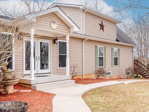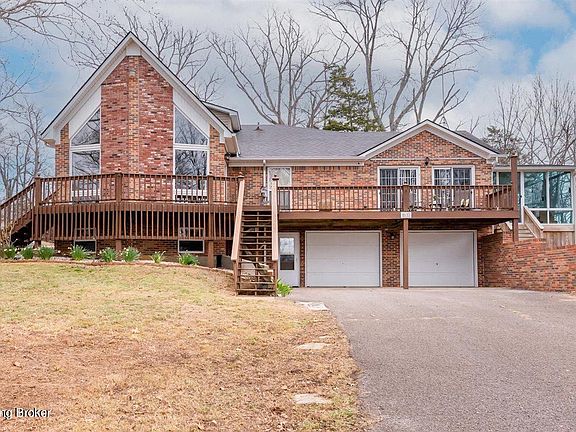 Sitting stately in the gated community of Doe Valley in Brandenburg, KY is this unique & spacious perfect home for entertaining. This home features 3 large bedrooms, a loft room with tons of potential, 4 1/2 baths, two of which contain updated shower towers! It also boasts TWO fireplaces, one wood burning, one gas, which give added coziness to the home. On the main floor living room is a full-size pool tablet that remains. In the kitchen you'll find an abundance of amish built, granite countertop cabinets, double gas oven & cook-top, breakfast bar & all stainless steel appliances. Included in the home is a Rennai tankless water heater, & a back-up generator w/a 4 sec start. 2-2 car garages, one on the main floor & another in the basement. A sun room & fenced yard are additional amenities
