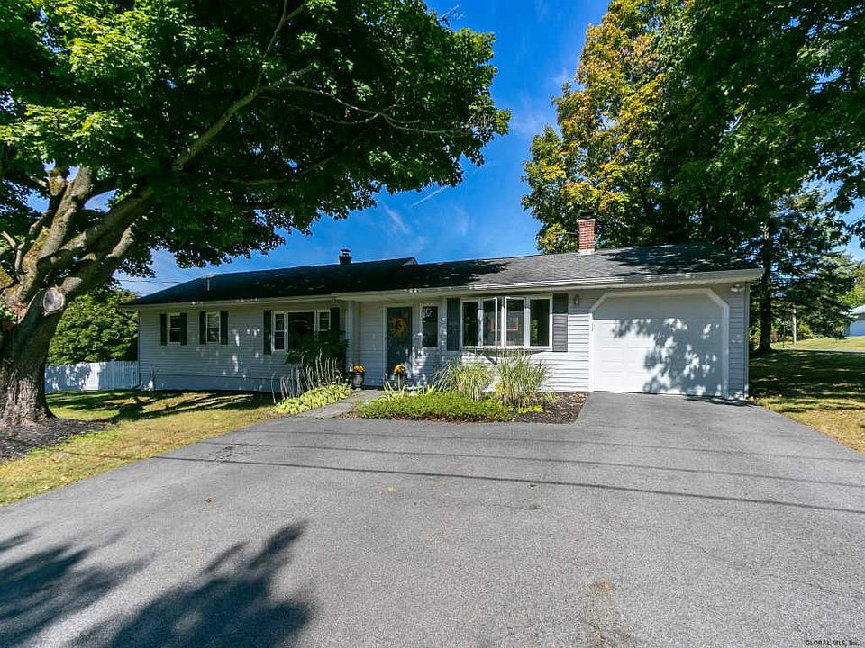 Call this one ranch galore! Step inside and be thrilled with the inviting interior features and layout of this 3-bedroom/1.5 bathroom, mint condition home! Large living room feels even more spacious with high, angled ceilings and 4-bay front window for streaming natural light. Stellar eat-in kitchen with tile floors, breakfast bar/center island plus room for a table all surrounded by oak cabinets, stone counters, new glass-tile backsplash and stainless appliances. Formal dining room with lovely hardwoods. Wood-burning stove, central air, full basement, washer/dryer, shed all set on a level, corner yard with in-ground pool and stamped pool deck! This is convenient one-floor living with all the bells and whistles. Not to be missed!