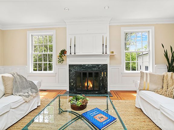 Looking for the perfect escape from the city? This stunning stone and clapboard Georgian colonial is a short walk to Greenwich train station, library, restaurants and vibrant Greenwich Avenue. Captivating interiors filled with natural light and offering a beautiful two story foyer leading to living room with fireplace, formal dining room and library/office with built-ins. Gourmet kitchen with oversized island and breakfast room. Fabulous family room with stone, gas fireplace adjacent to kitchen with french doors opening to large deck overlooking private/ manicured backyard. Five charming en-suite bedrooms plus sumptuous master bedroom suite with exquisite coffered ceiling, dimmable lighting, two custom-made wood walk-in closets and elegant master bathroom. Extras include: rich hardwood floors, wet bar with wine fridge, flagstone terrace, central air, security system, heated 2 car garage & storage. Bonus: walkout lower level of 2,500+ Sqft ready to be finished. The house is in pristine, turnkey condition, "remodeled to perfection" and lovingly maintained. Hidden gem with private green space front and back Half acre plus 5,000+ SqFt of privacy.