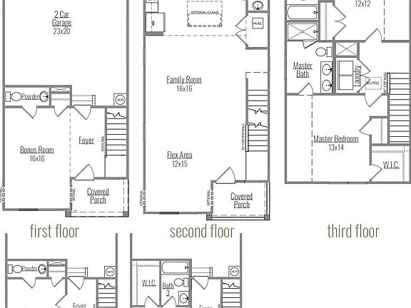 To Be Built: The Harrington- Three story w/ upstairs master. First floor features entry foyer, bonus room, half bath. Second floor features open family, kitchen, dining, half bath. Thrid floor features owners suite with private bath, secondary bedroom with bath.