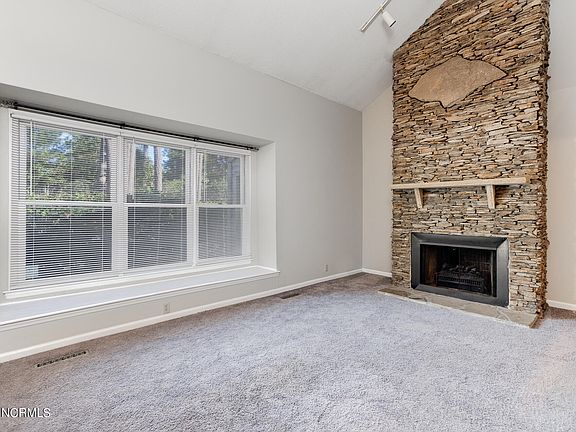 Clean and fresh condo living with updates! The custom stone fireplace greets you as you walk in, the kitchen has a range/microwave combo and newer refrigerator, and there is ample storage in the pantry. This condo includes a full bathroom and closet downstairs. All carpet in the condo was recently replaced and all trim was repainted this year! The upstairs loft features three full size skylights, a bedroom, closet and full bathroom updated with a new vanity and commode. The Country Club Driving Range is just out back for the avid golfer! HOA covers many items including but not limited to: water, cable TV, internet, trash, grounds and yard maintenance, pest control, deck maintenance, etc. Only minutes to Seven Lakes, Pinehurst, and Southern Pines!