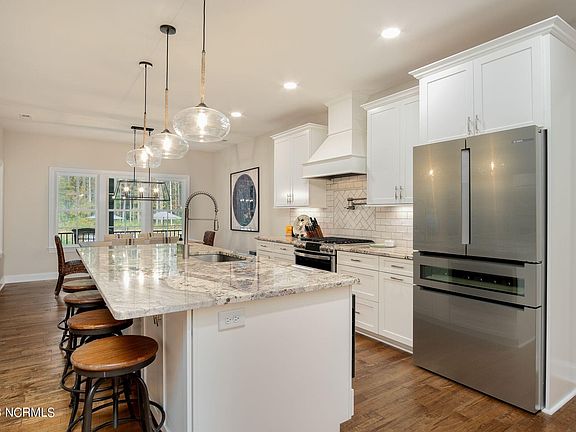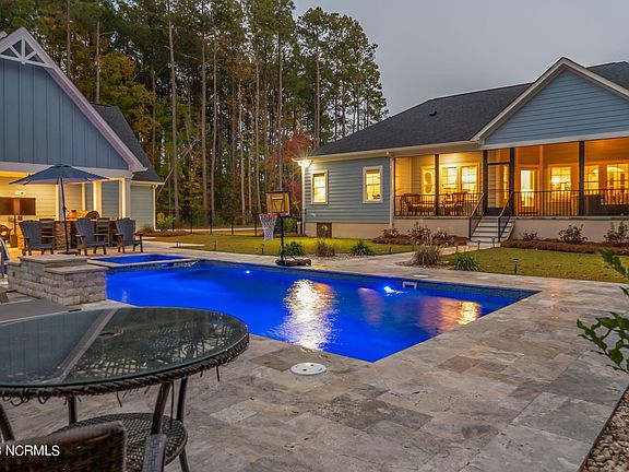 Welcome to luxury living in the heart of the equestrian community of Gables Run! This exquisite 4-bedroom, 4.5-bathroom home, situated on an expansive 7.72 acres, epitomizes Southern charm and modern elegance. Boasting a total of 3,608 square feet in the main home, the property also includes a stunning, 1,970 square foot guest house that adds to the allure of this exceptional estate. As you approach, you are greeted by a massive front porch adorned with two distinct sitting areas, offering a perfect vantage point to enjoy breathtaking sunrises. Move into the main home, where a formal dining room sets the stage for refined entertaining. The open floor plan seamlessly connects the living spaces, flooded with natural light and anchored by a cozy gas log fireplace. The kitchen is a chef's dream, featuring an oversized island with additional storage, top-of-the-line stainless steel appliances, granite countertops, and a spacious kitchen dining nook. All three bedrooms on the main floor boast private bathrooms, with the owner's suite standing out for its fully tiled bathroom, standalone soaker tub, and a generously sized walk-in shower. Upstairs, an additional bedroom with its own bathroom adds to the home's versatility. The screened porch offers breathtaking views of the private property and the enticing in-ground pool. The pool area is a haven for outdoor entertainment, featuring an outdoor kitchen complete with a massive granite bar, custom stonework, and an inviting outdoor fireplace. For extended guest stays, the guest house offers two bedrooms, each with its own bathroom. An upstairs bonus room adds to the functionality of this separate dwelling. Conveniently located just minutes from Historic Downtown New Bern and Carolina East Medical Center, and a short drive to MCAS Cherry Point, this property seamlessly blends tranquility with accessibility. Don't miss the opportunity to make this sophisticated residence your home. Call us today for your private tour.