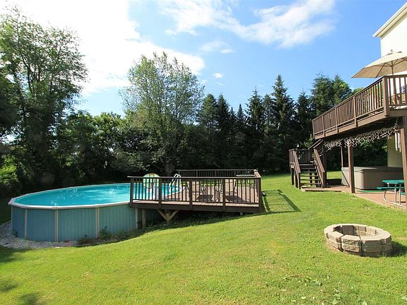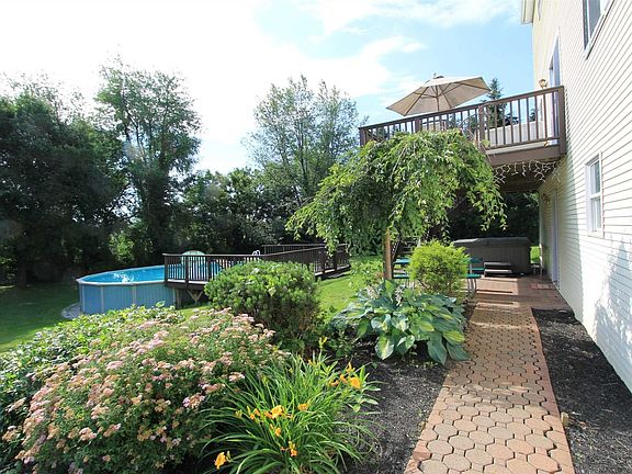 Spacious four-bedroom colonial in a nice setting with views of protected farmlands and close to village and schools. House features a great big eat in kitchen with breakfast bar, nice appliances and breakfast bar overlooking spacious family room with fireplace. Sliders to big deck with access to above ground pool and a big play yard. Entry hall, formal living room and dining room with hardwood floors, and powder room complete first floor. Second floor features a large master suite with master bath including soaking tub. Three more bedrooms all with hardwood flooring, full bath and laundry closet complete the picture. Lowest level has a great finished TV, media, play room or office space with A/C. Two-car garage, nicely maintained landscaping, and just minutes from schools, Rec Park, shopping and area cultural venues.