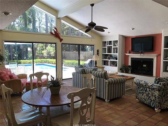 This beach cottage is adorable. Open floorplan with high ceiling. Kitchen open to dining open & living room. Guest bedrooms open onto courtyard used as a putting green. Large Master bedroom opens to the pool. Large master bath with walk in closet. Heated pool in beautiful backyard setting of trees and lagoon in the rear. Bike to the beach in 10 minutes or to Harbour Town. Granite counters in kitchen, beautiful Mexican tile throughout. Garage plus carport. Perfect for living or renting. Owner has successful rentals that will amaze you.