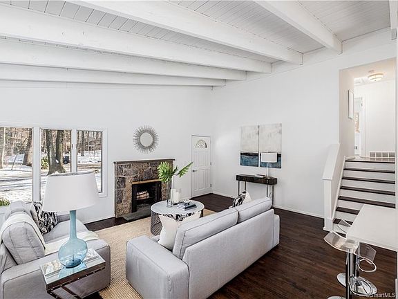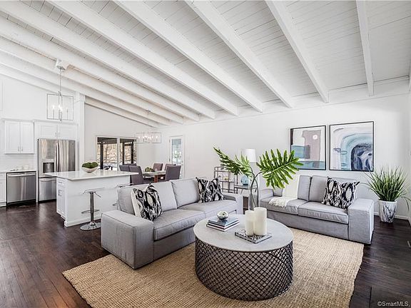 Experience the pleasure of living in a freshly updated home, complete with brand new appliances and cabinetry, richly stained floors and a light, open floor plan. Not your typical split, this home has just been reimagined and is ready for its next loving homeowner. The open ground floor features a soaring vaulted ceiling and sparkling new light fixtures, while a wood-burning fireplace in the living room area is a welcome retreat. The kitchen boasts new GE Profile appliances, quartz counters, white cabinets and a new island with room for stools. A dining area is great for entertaining and leads directly to a large, screened porch overlooking the one-acre yard. Down a few steps is the family room with built-in bookshelves and storage. A newly updated full bathroom on this level with shower is convenient for guests, while a laundry room is complete with a new GE washer and dryer. The crawl space creates extra storage below. Upstairs, the master bedroom and two additional bedrooms all sport new door hardware and hardwood floors. The bathroom in the hall has also been updated with modern finishes. Outside, the yard is flat and dry and the house is near the end of the cul de sac, perfect for bike riding! The street is walkable to the Wakeman Town Farm and playing fields, plus Bedford Middle School and the award-winning Staples High School. Couple this with convenient commuter access and sandy beaches, and you can see what tremendous value is offered at 17 Half Mile Common!