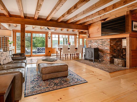Enjoy stunning views from this beautifully updated authentic post and beam home that is situated high overlooking the sprawling back lawn that leads down to the water and private tidal dock. A blend of rustic wood accents with sleek modern touches, provides a sense of comfort and luxury throughout. The newly remodeled high-end kitchen with quartz countertops, stainless appliances, and center island overlooks the well-appointed sunroom with vaulted ceilings and skylights leading to the rear deck of the home which is ideal for outdoor enjoyment. The open kitchen, dining area and living room are centered around the brick hearth and woodstove on the living room side with the kitchen side featuring a woodburning fireplace. The spacious living room and dining area also have a slider to the deck. The remodeled mudroom with laundry room and half bath is conveniently located off of the two car attached garage. The rear of the garage features a bonus room, perfect for an art studio, in-home office, gym or den. Upstairs is the primary suite with vaulted ceilings, spa-like bath, walk-in closet and a private rear balcony for soaking in this peaceful setting. Three additional guest rooms sharing an updated full bath with custom tiled shower/tub are also on this level. Other features include central air, a hard-wired generator, an encapsulated crawl space, additional storage and landscaping. Septic design for 3 bdrms - vision appraisal has 4.