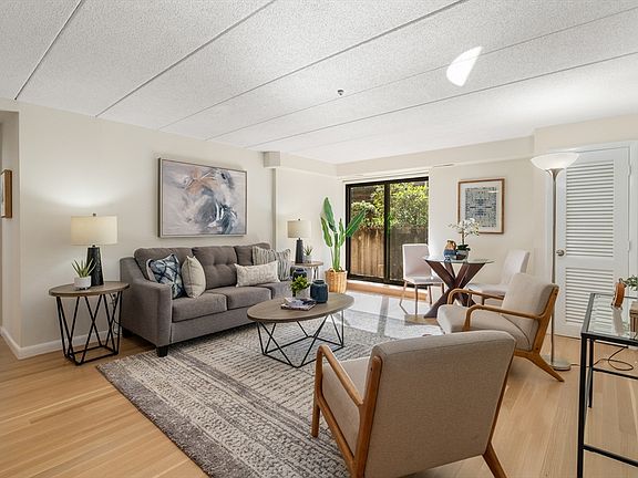 Nestled among beautiful Victorian homes, this mid-century modern building is tucked away on a side street between Harvard Square and Huron Village. Tastefully renovated for stylish urban living, this rare home offers an open floor plan and and plenty of storage throughout. Through the entry hall, the 18' living/dining area has sliding glass doors to the massive exclusive-use courtyard surrounded by mature plantings. The sleek kitchen was completely reimagined by KitchenVisions and showcases stone countertops, a bar peninsula, full-size stainless steel appliances, and custom cabinetry with open shelving. The bedroom offers 2 double closets and access to the 12' solarium. Equipped with shades and a sink, the solarium has sliding glass doors to the courtyard as well. A renovated hall bathroom offers beautiful cabinetry and chic fixtures. Other amenities include deeded parking (space #18), in-building laundry room, and central air conditioning. Just a few blocks from the Radcliffe Quad.