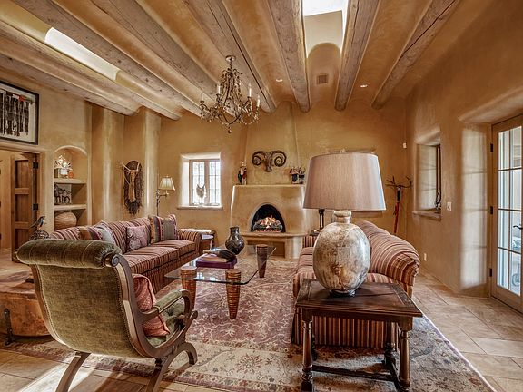 Panoramic, breathtaking views to the East, West and North. Located in a gated subdivision, Tesuque Villas, just 15 minutes from downtown Santa Fe, and minutes from the Four Seasons Rancho Encantado Resort and the Tesuque Village Market, this 3700 sq. ft. main house and 1400 sq. ft. guest house are sited on 3 individually parceled lots, where you are surrounded by 8.58 private acres with spectacular views. MAIN HOUSE: The 4 bedroom/3 bathroom main house has artistry throughout with high, coved viga ceilings, Roman columns, numerous nichos, fireplaces throughout, beautiful arches and 2’ thick walls for superior thermal mass. The generous kitchen, with its large island and high-end stainless steel appliances flows into the dining and living rooms which all have direct access to the deep West-facing portal. The panoramic views from both the West and East-facing portals allow you the feeling of being nestled, yet also experiencing the beauty of the horizon. GUEST HOUSE: The guest house, which consists of 2 bedrooms, 1 large office, a ¾ bathroom and a gym is located at the adjacent 11 Heather Lane. It has its own, private driveway but is connected to the main house via a lovely walking path. If a kitchen is desired in the guest house, it is possible to convert the gym space into a kitchen. With 3 separately deeded lots, this impressive property offers the Buyer flexibility of use in the present and in the future! Magical views and exceptional craftsmanship combine to make this Southwestern estate your Santa Fe dream home.
