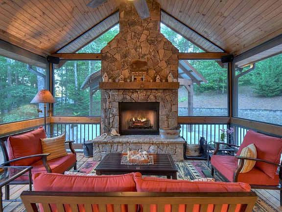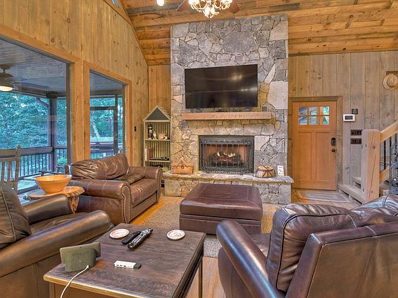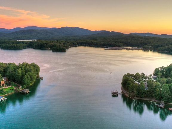 LAKE BLUE RIDGE LIVING AT IT'S BEST! Premier 4/4 home is just minutes to historic downtown area & nestled on two gentle waterfront lots in quiet cove with long range lake & Mountain View...main house exudes rustic elegance with 3 bedroom/3 baths, master suite boasts private balcony & spa bath with waterfall shower along with lovely loft area, sky high ceilings & massive stone fireplace adorns open living/kitchen/dining areas with stainless appliances, custom cabinetry & pantry, sunny keeping room perfect for library/home office & more, fully finished terrace level provides den, rec room, wet bar & guest quarters, layers of covered porches & decks lead to lake side party porch with outdoor FP as well as covered hot tub deck, plentiful windows & storage, meticulously maintained, lush & low maintenance yard opens to boat/swim dock on deep water, detached garage with gorgeous guest cottage living above, RV hookup, large carport, just too many amenities and extras to list...this is a must see for lake lovers...perfect for homeowner who loves to entertain or first class vacation rental...this is the one you've been waiting for! Tasteful furnishings negotiable at addt'l price for turn key transaction.