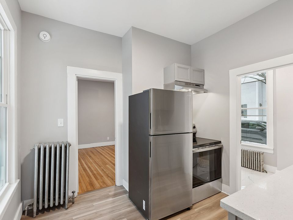 Newly refurbished 1st floor unit, in a 4 unit building. New kitchen with quartz countertops, new stainless steel appliances, beautifully refinished wood floor in the bedroom, tall ceilings with great natural lighting, cast iron radiators (heat included in rent), washer and dryer in unit, storage space (labeled living room on floor plan) for bikes and gear etc. dedicate parking- its a real magnificent 1870 building that has been updated throughout- new roof, all new windows, 4 new hot water heat pumps, wall insulation is blown in within the past 10 years. Spectacular neighborhood, one block off of Maine St, in striking distance to all that is downtown Brunswick! One year lease, Landlord pays for the heat, water, sewer, trash/recycling, landscaping, snow removal. Tenant pays for the electricity- hot water is electric.